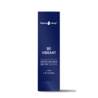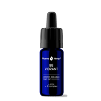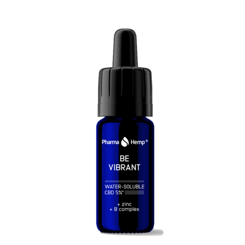 BE VIBRANT Water-Soluble CBD 5% + zinc + B complex drops can be purchased in a 10ml blue glass bottle with a pipette.
